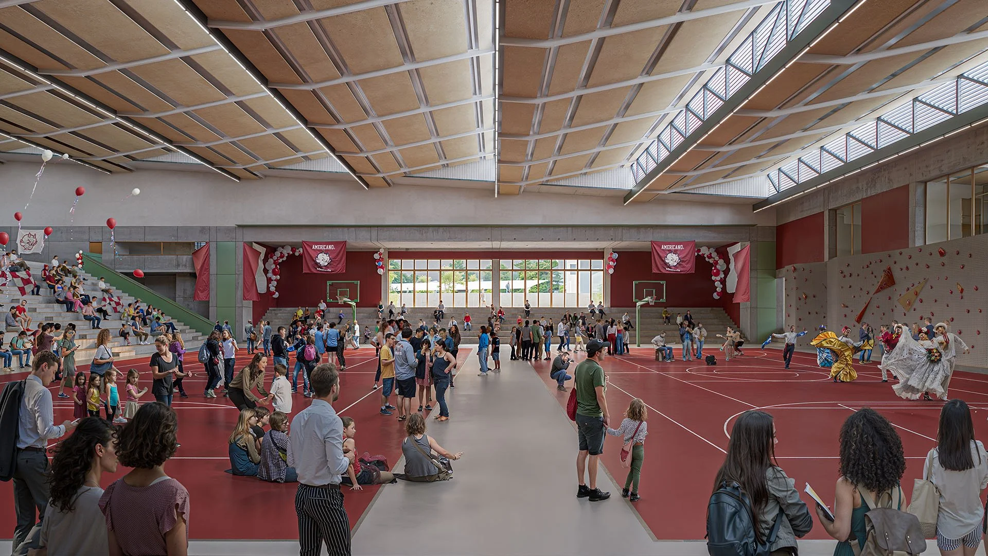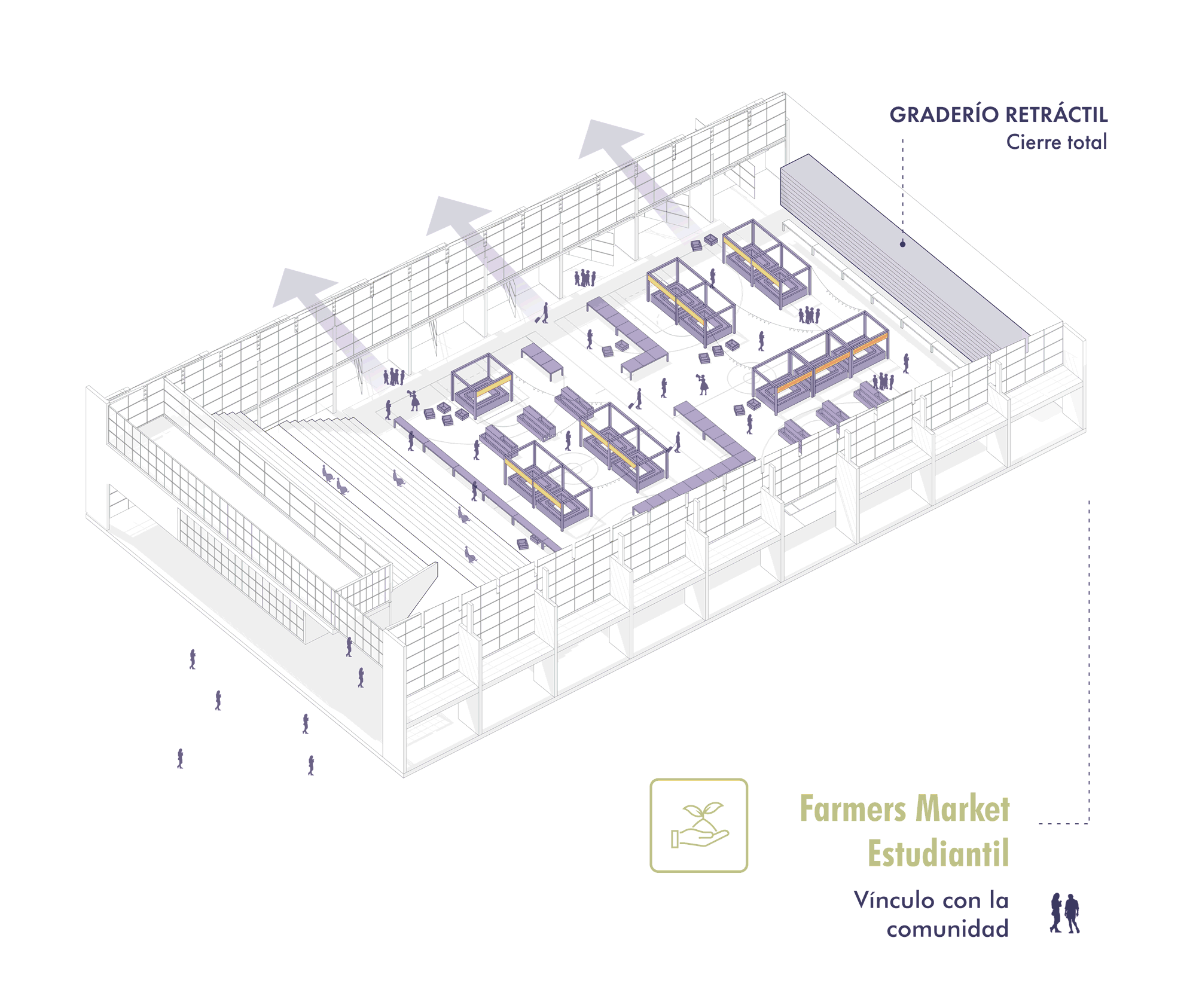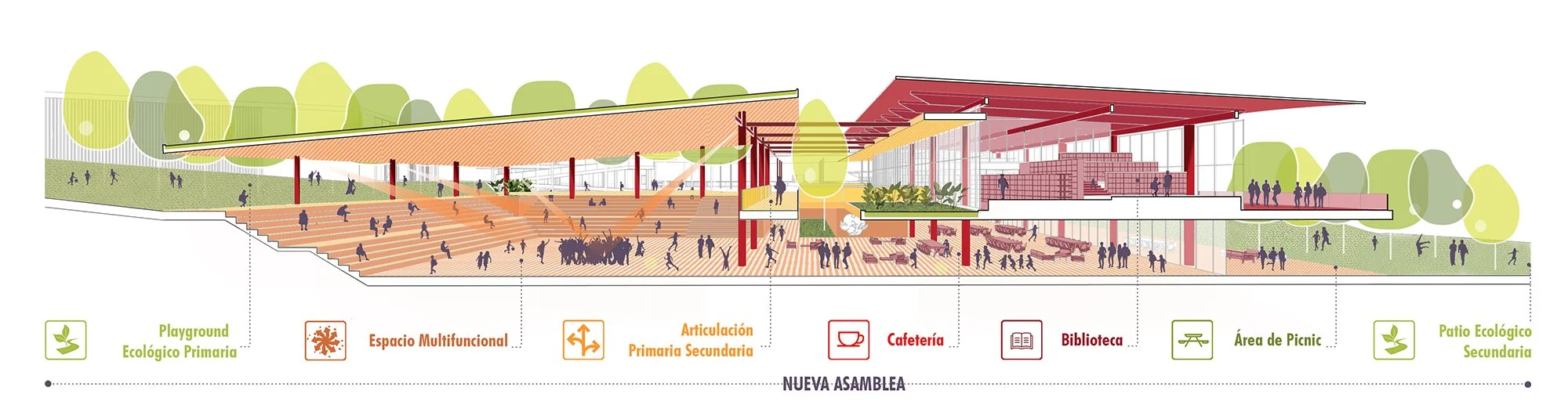 La nueva Asamblea del Colegio Americano, establece un cruce social para todas las divisiones escolares, con una biblioteca central, la cafetería principal, y un espacio multifuncional. Es un articulador de circulaciones que enlaza de manera fluida el ingreso, a través de la Plaza Mirador, con el Paseo Democrático, la primaria y la secundaria.