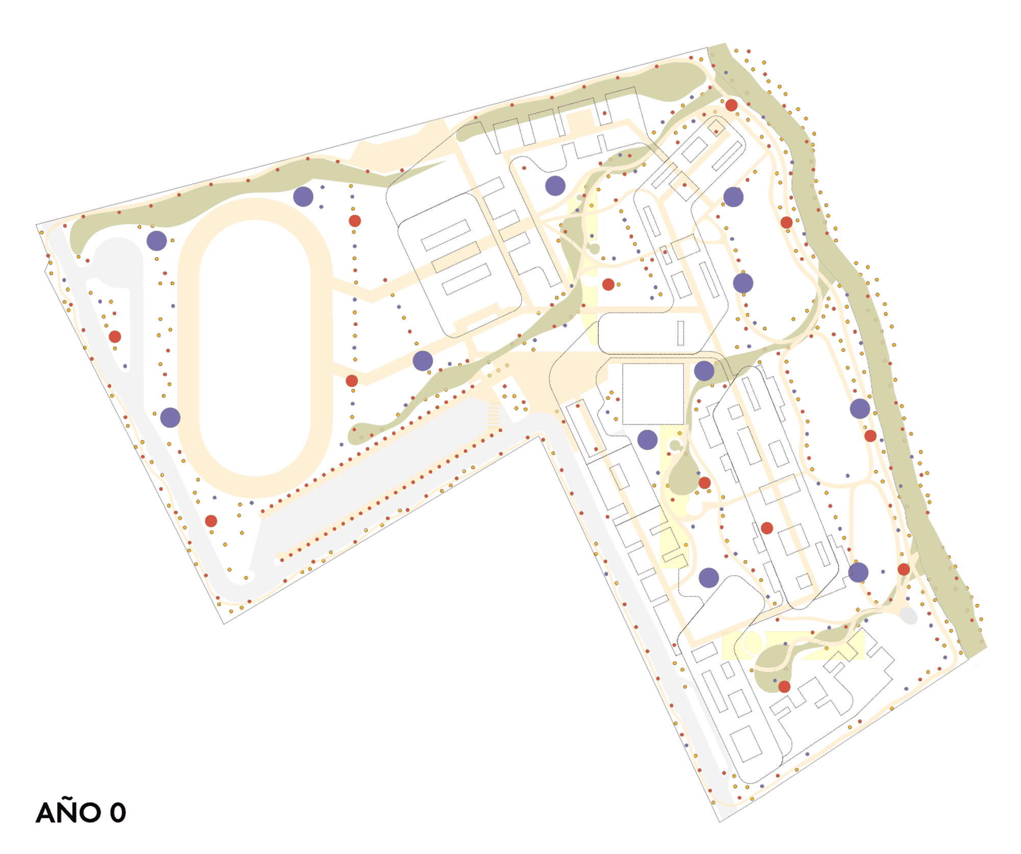 La altura y distribución de los árboles componen el complejo anticipando la evolución del paisaje en los próximos 25 años.