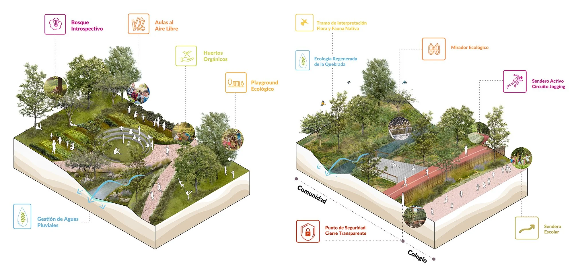 Conectarse con el paisaje y la ecología del sitio se convirtió en un conductor de las decisiones del plan. A través de la regeneración de la quebrada, se establece una conexión directa entre el rico contexto ecológico circundante y la comunidad académica. La quebrada y los corredores verdes desempeñarán un papel destacado en el avance de la agenda de sostenibilidad del Colegio Americano y en la transformación del campus en un laboratorio viviente.