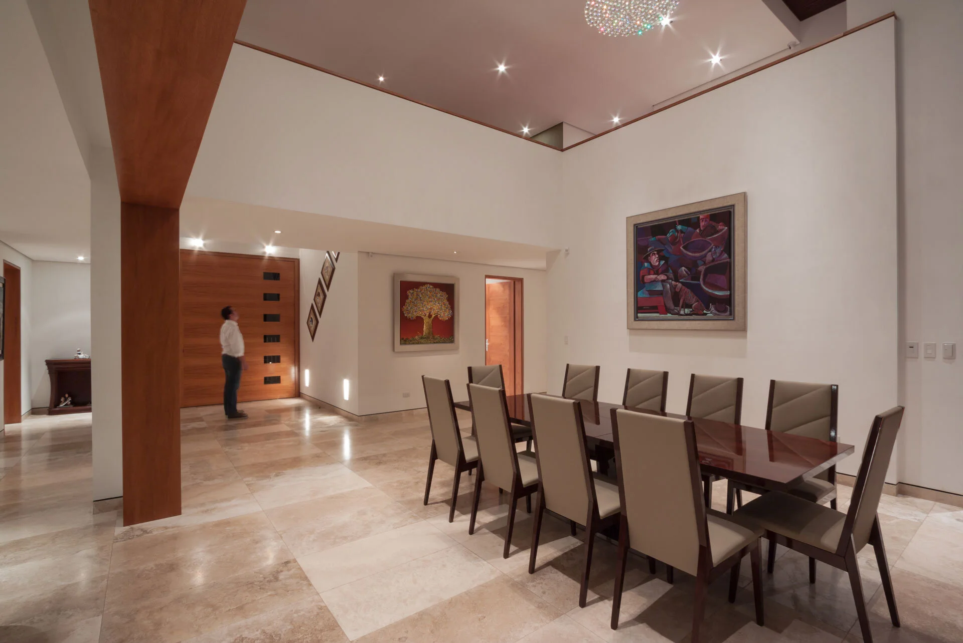 El comedor es el sitio de integración familiar. Se jerarquiza con mayor volumen espacial de doble altura. Esto permite generar una serie de experiencias espaciales y obtener visuales interesantes desde el puente hacia el jardín+quebrada, al mismo tiempo que valle+volcán.